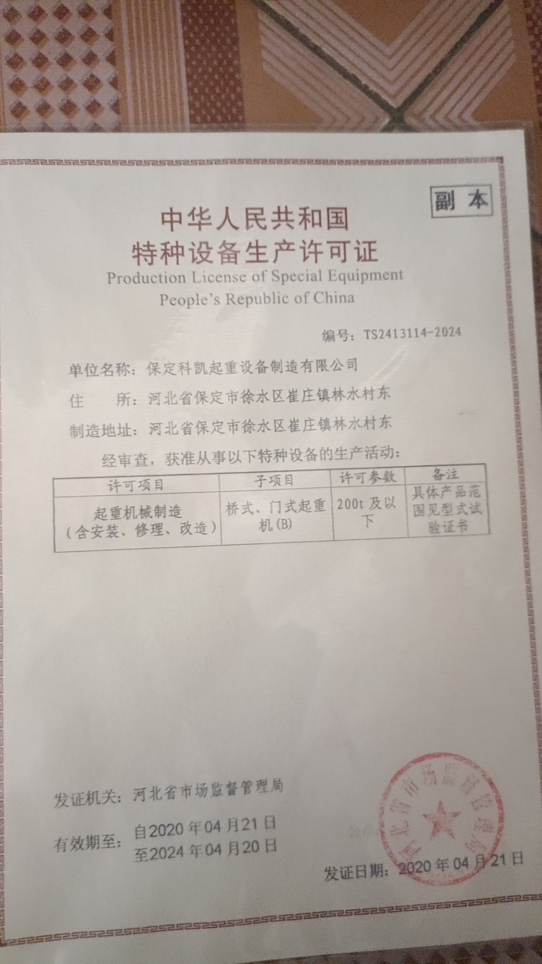 | 發(fā)證機(jī)構(gòu): | 河北省市場(chǎng)監(jiān)督管理局 | 發(fā)證時(shí)間 : | 2020-04-21 |
