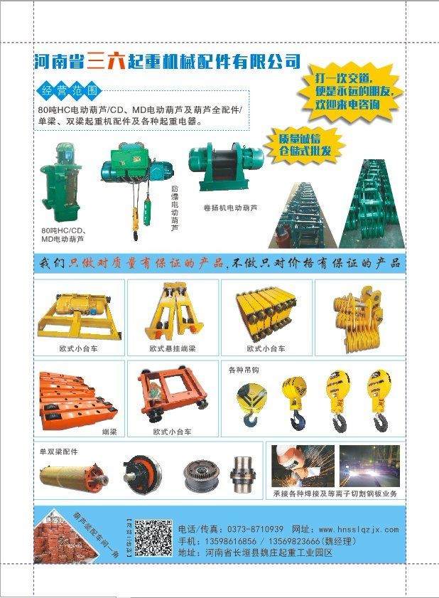 河南省三六起重機械配件有限公司專業(yè)生產(chǎn)及銷售起重配件,主要銷售:CD1、MD、HC、BCD各種型號電動葫蘆、葫蘆配件、電機、葫蘆減速機、葫蘆全配件、起重機LD300輪、LD400輪、雙梁起重機輪組、卷筒組、吊鉤組、聯(lián)軸器、電纜卷筒、起重機安全滑線、聚氨酯緩沖器、彈簧緩沖器、液壓緩沖器、制動器、旋臂吊、液壓平臺等起重機配件。