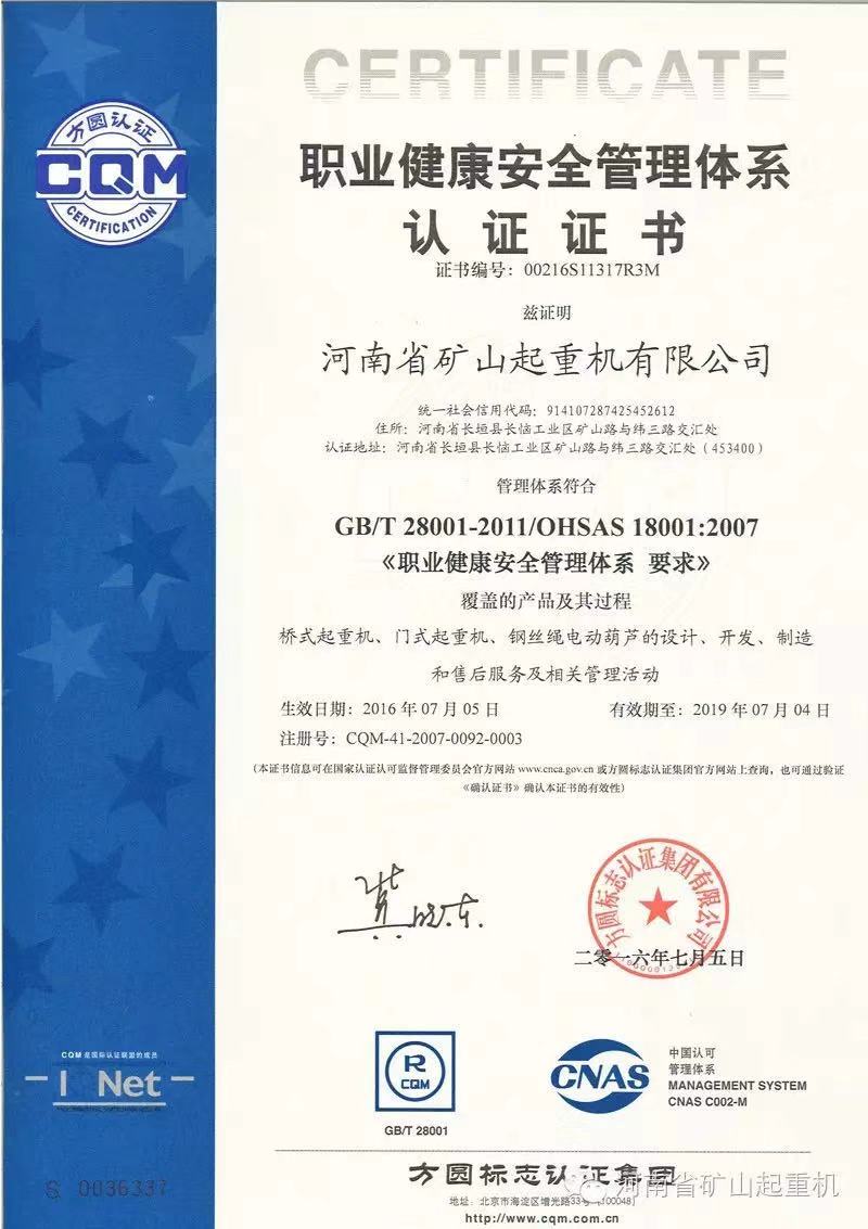 » 職業健康安全管理體系認證證書