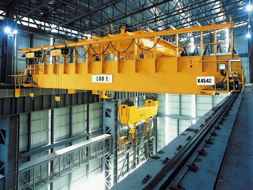 橋式起重機是橫架于車間、倉庫和料場上空進行物料吊運的起重設備。由于它的兩端坐落在高大的水泥柱或者金屬支架上,形狀似橋。橋式起重機的橋架沿鋪設在兩側高架上的軌道縱向運行,可以充分利用橋架下面的空間吊運物料,不受地面設備的阻礙。它是使用范圍**廣、數量**多的一種起重機械 。