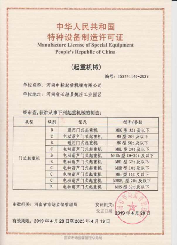 河南中標(biāo)起重證書(shū)展示