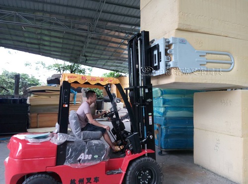 大體積的塊狀海綿,在橡膠、化工、化纖等行業應用十分廣泛。隨著家居生活和工業應用的需求增加,海綿的應用也隨之而擴大,目前許多相關企業都開始使用諾克海綿抱夾配合叉車來搬運。