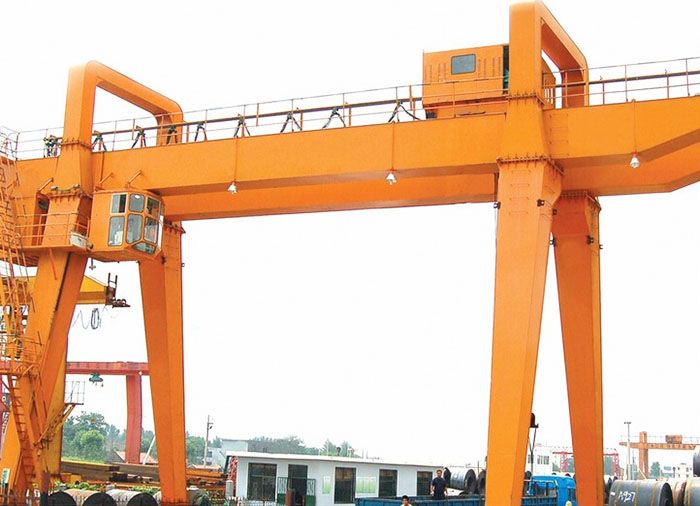 它的金屬結(jié)構(gòu)像門形框架,承載主梁下安裝兩條支腳,可以直接在地面的軌道上行走,主梁兩端可以具有外伸懸臂梁。