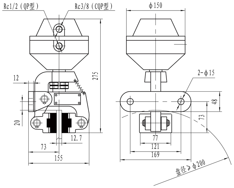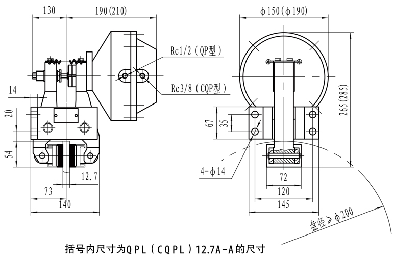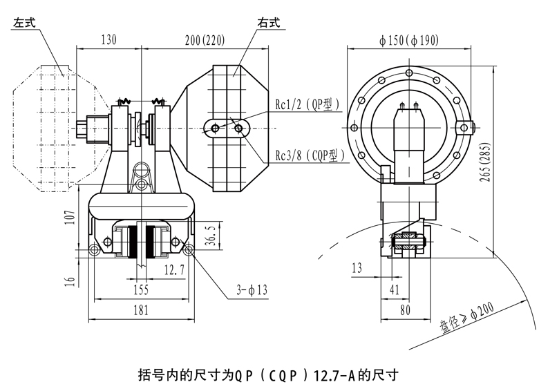 例如:1、選用QP12.7型、A型氣包、彈簧為6根、氣包左式安裝,其訂貨標記為QP12.7-A-6左;
