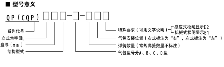 主要特點:QP 系列為彈簧制動,氣動釋放; CQP 系列為氣壓制動,彈簧釋放。 整體結構簡單,體積小,重量輕。 無石棉制動襯墊,綠色環保。 制動襯墊安裝采用壓簧卡裝式,更換方便快捷。 制動襯墊磨損后調整方便簡單。 QP 系列每種規格制動器的一種盤徑可進行四級制動力矩調整。 所有動力源無需單獨設置,可與已有的空壓站并網使用,在供氣線路中加裝調速閥,制動時間可實現無級調整。