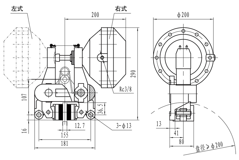 注: 1 、可生產不同盤厚、不同安裝尺寸的氣動鉗盤制動器。 2 、具體型號、結構外形尺寸保留更改的權利。